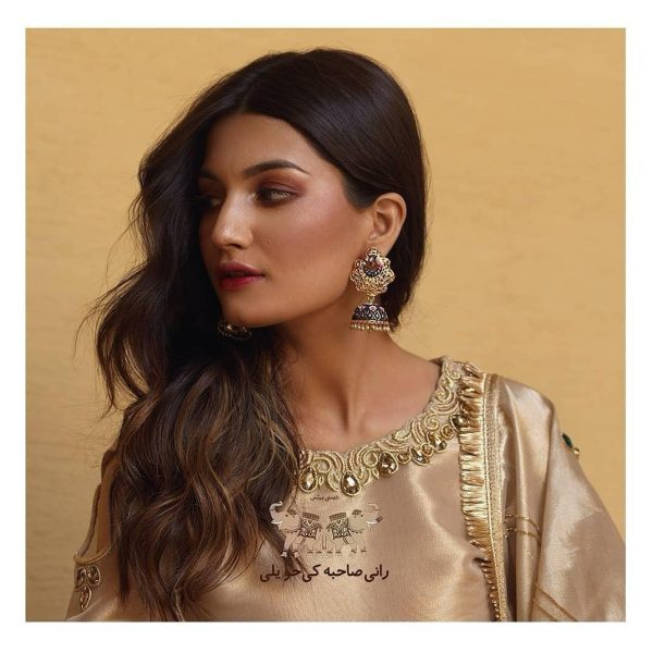 This stunning outfit features a beautifully crafted mesoori shirt paired with dyed crush gharara, with its flowing folds and delicate texture, creates a dramatic and eye-catching effect. The golden zardozi and stone work adds a rich and regal touch, making this outfit perfect for special occasions..