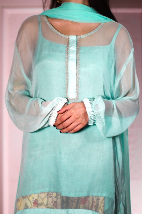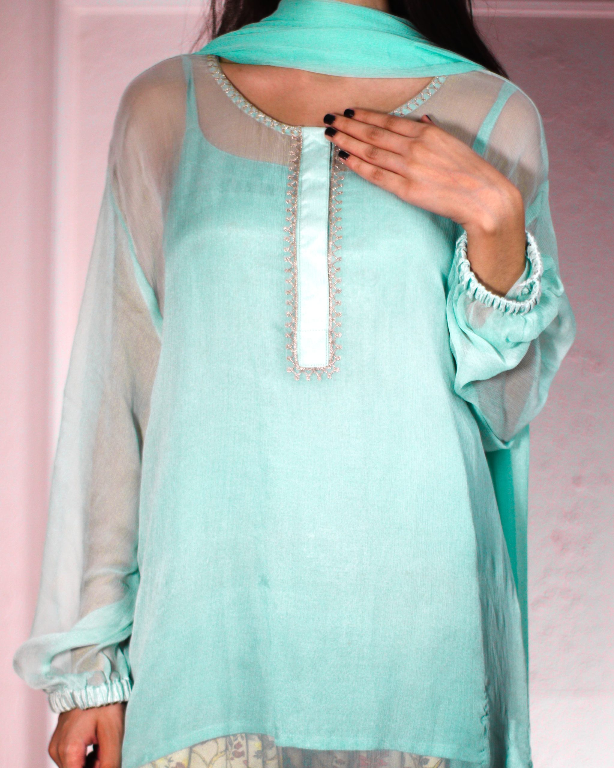 The striking Aqua blue chiffon short shirt features intricate zari work on the neckline. Paired with a printed silk shalwar, the luxurious fabric drapes gracefully, blending comfort and styl e. This outfit harmoni zes classic charm with contemporary flair, perfect for an y special occasion