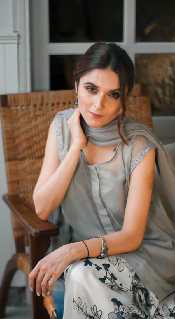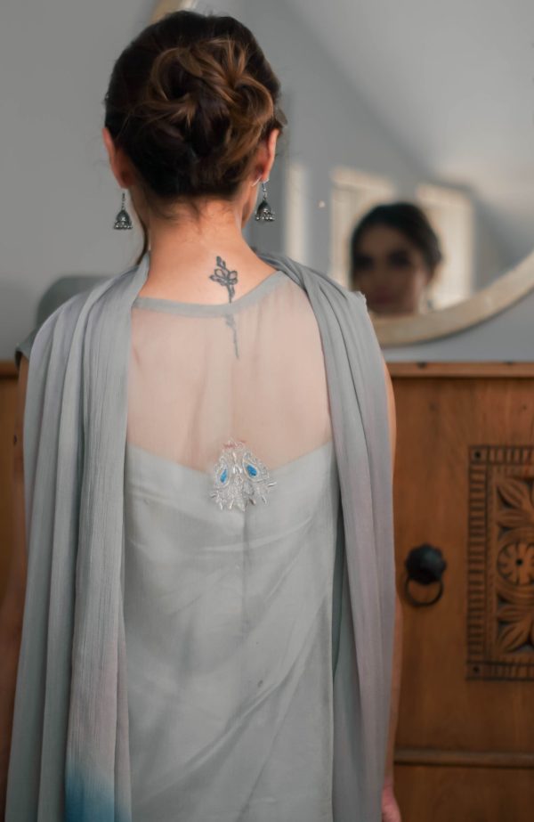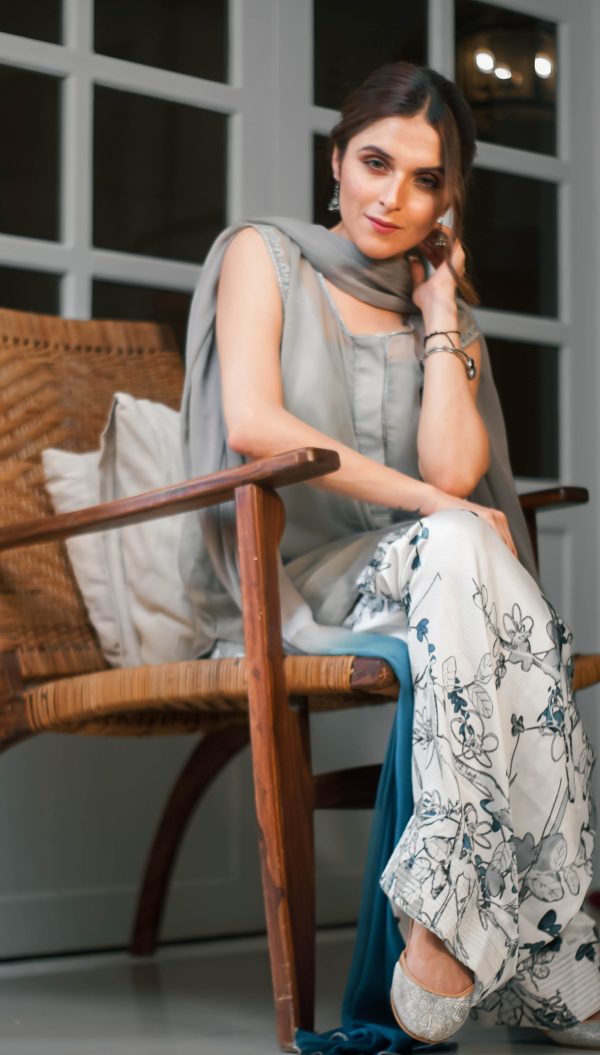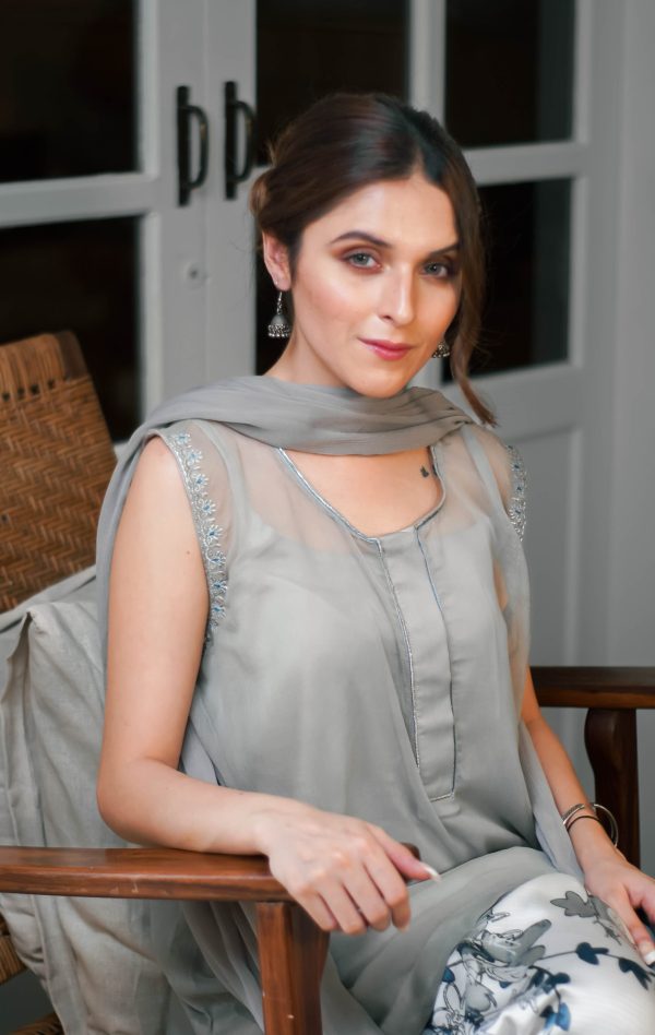 LUXURY GREY CHIFFON SHIRT WITH INTRICATE ZARI RESHAM WORK AND PRINTED SILK SHALWAR, PERFECT FOR SPECIAL OCCASIONS.