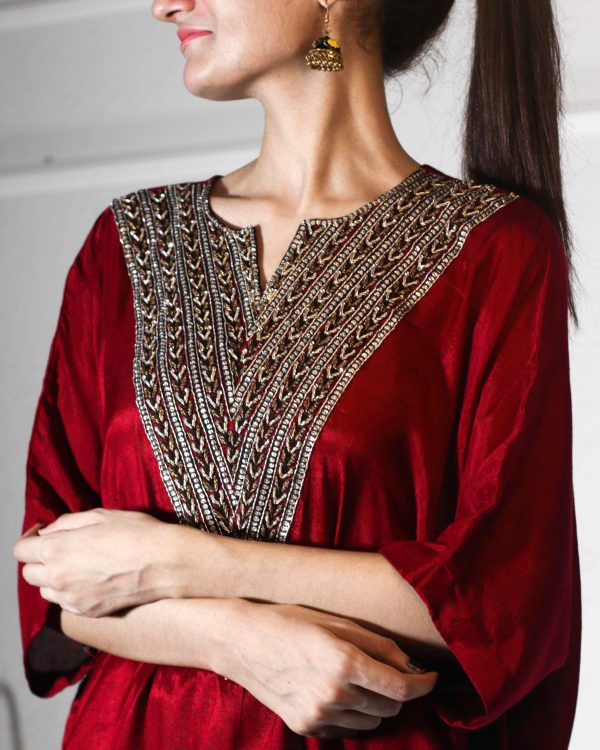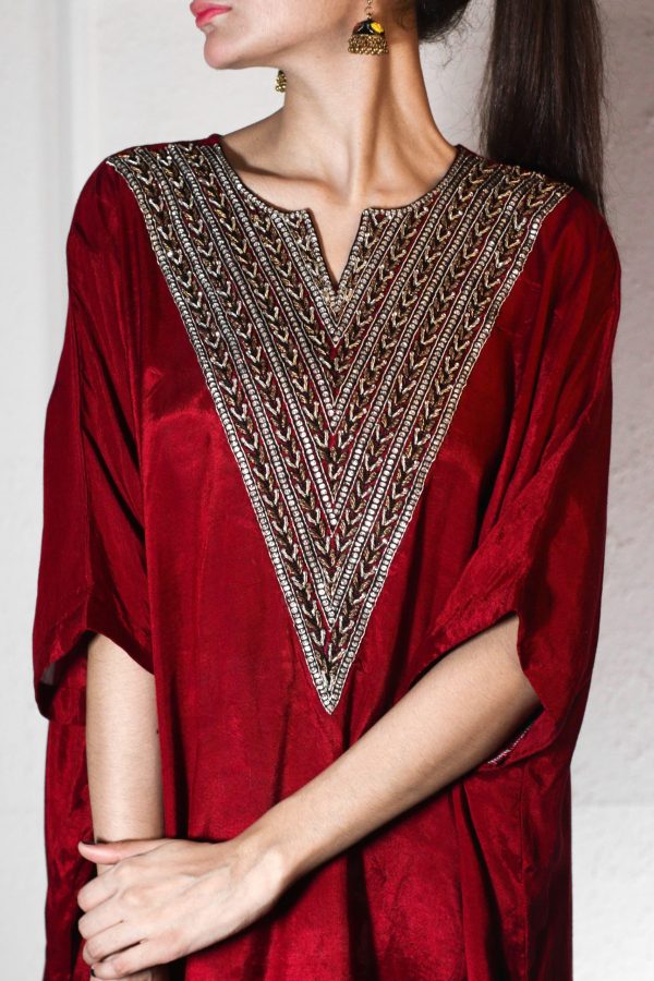 luxurious Cotton Silk Kimono Shirt, featuring an intricately embellished neckline adorned wi th stunning dabka stones. The rich fabric ensures both comfort and elegance, while the kimono – inspired design adds a contemporary twist to a classic silhouette. Perfect for any special occasion,