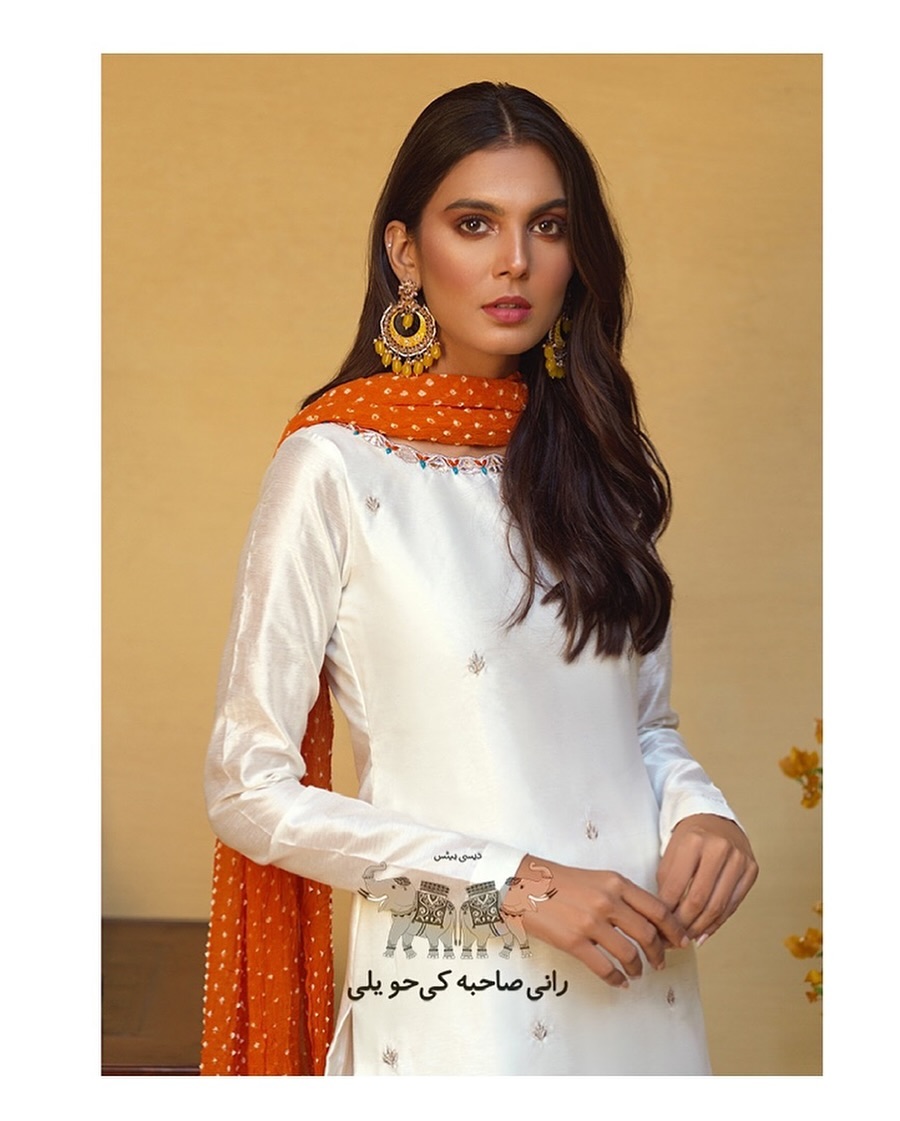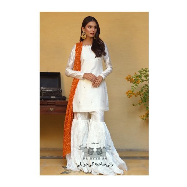 “Exuding elegance and poise, this stunning ensemble features white raw cotton shirt with crush gharar, perfectly paired with a vibrant orange chunari dupatta that adds a pop of color and a touch of sophistication, all beautifully enhanced with exquisite embroidery that adds a level of glamour to this already-stunning outfit!”
