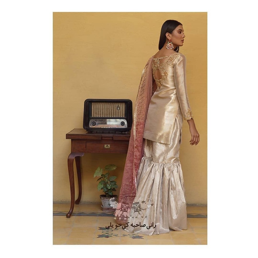 “Embrace elegance with intricately designed dabka and cutdana embellishments on pure lamba tissue kurtis, paired with vivacious ghararas. Complete your exquisite look with our detailed dupattas, delicately adorned with signature elephant motifs, symbolizing